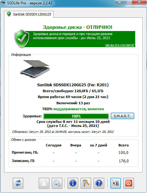 Поставил программку SSDLife. Типа следит за здоровьем SSD-диска и все такое. Отслеживает суточное потребление трафика (где прошивка диска позволяет) и показывает, как это все влияет на состояние износа.