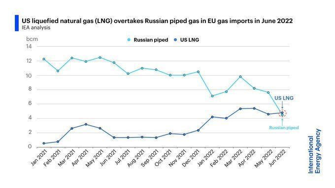 Связи с Европой рвутся на глазах. «Недавнее резкое сокращение поставок российского газа в ЕС означает, что [июнь] стал первым месяцем в истории, когда ЕС импортировал больше газа в виде СПГ из США, чем по трубопроводам из России», – написал в Twitter исполнительный директор Международного энергетического агентства Фатих Бироль.