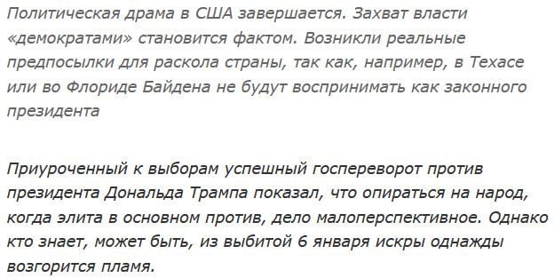 "....Первое, что прямо-таки бросается в глаза - это фактическое сворачивание режимов буржуазной демократии, которые, как казалось очень и очень многим, установились в странах западного мира после Второй мировой войны незыблемо. Неприкрытая, неслыханная прежде фальсификация результатов президентских выборов в США при помощи цифровых технологий, помноженная на задействованный элитами “административный ресурс” (именно это имел в виду Д.Трамп, раз за разом заявляя о “краже выборов”) даёт нам наглядное представление о направлении эволюции политических систем, определявшихся ранее как демократические..."