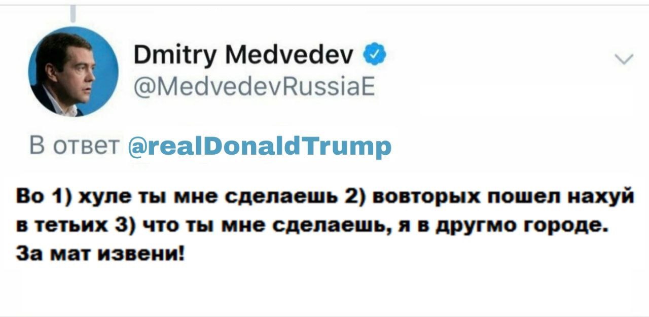 Также по мнению бывшего главы РФ, если его слова «вызывают столь нервную реакцию у целого столь грозного президента США, значит, Россия во всём права и продолжит идти своей дорогой».