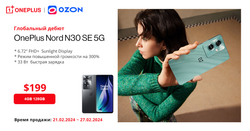 Стартовали продажи смартфона OnePlus Nord N30 SE 5G NFC, специальная акция продлится неделю - с 21 по 27 февраля 2024 года: купить этот смартфон на Озоне, купить этот смартфон на Aliexpress.