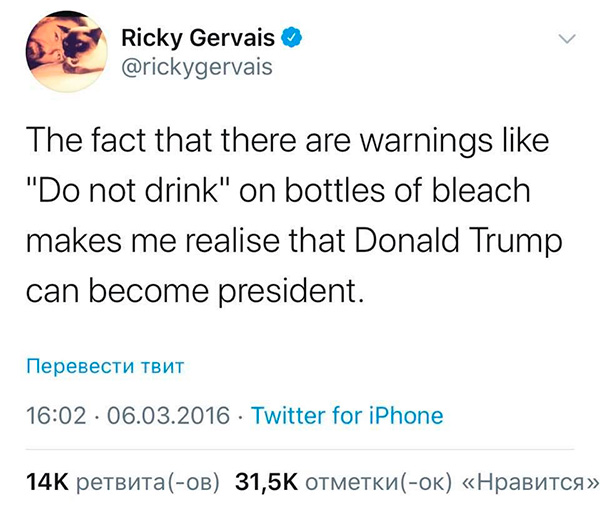 Рики Джервейс написал в 2016 году: "Тот факт, что на бутылках отбеливателя пишут предупреждение "Не пейте", заставляет меня осознать, что Дональд Трамп может стать президентом. Рики что-то знал, он точно что-то знал!