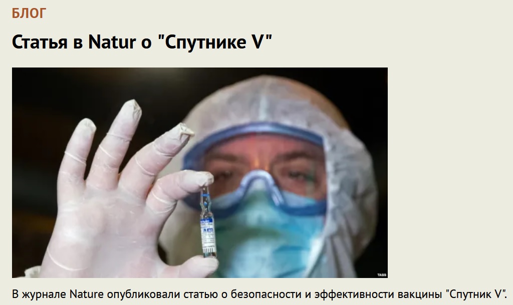 Про "научную статью в Nature о признании российского "Спутника" эффективным и безопасным" – как-то так написали примерно все СМИ, не только пропагандистские. Заметка действительно есть [1], но она опубликована в научно-популярной, а не научной секции – это такой раздел "Коротко об интересном" для читателей журнала или сайта. Ее автор – не ученый, а внештатный корреспондент этой секции, научный журналист. Причем, кстати, научный журналист, не очень вникший в реалии – например, в лиде написано, что признание "Спутника" тормозится из-за редких побочных эффектов. Это даже близко не так. Комментарии некоторых экспертов в заметке тоже, скажем так, далеки от понимания процессов. И в целом в статье не описаны или описаны смазанно основные проблемы, из-за которых европейский регулятор ЕМА все еще не вынес решения по одобрению или не одобрению – например, потому, что наши так и не прислали им все запрашиваемые документы.