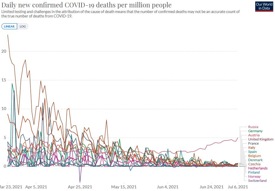 Ну и закономерный результат, в Европе смертность стремиться к нулю, а в России бьёт все рекорды.