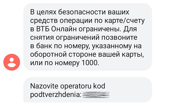 Ну, думаю, ладно, перезвоню, делов-то. Звоню в банк. Переводят на оператора, объясняю ситуацию. Та говорит, что сейчас переведет меня на отделение, которое занимается блокировками. Переводит (то есть, заметьте, это все идет разговор с банком, куда я сам позвонил). Говорит оператор - ну, скажем, Дарья. Я ей объясняю ситуацию, Дарья говорит, что система безопасности часто срабатывает на запросы кредитов, потому что мошенники, получив доступ к счету, пытаются запрашивать кредиты и сразу уводят деньги после получения кредита. Поэтому банку нужно убедиться, что я - это тот, за кого себя выдаю. Ну, говорю, давайте убедимся, дело полезное. Дарья задает обычные полагающиеся вопросы (дата рождения, последние цифры банковской карты и срок ее действия, адрес прописки), а потом говорит, что для завершения процедуры она должна мне перезвонить (тут я сразу начал напрягаться) и кроме того, когда она мне перезвонит, то мне на телефон пришлет по SMS код, который я ей должен назвать.