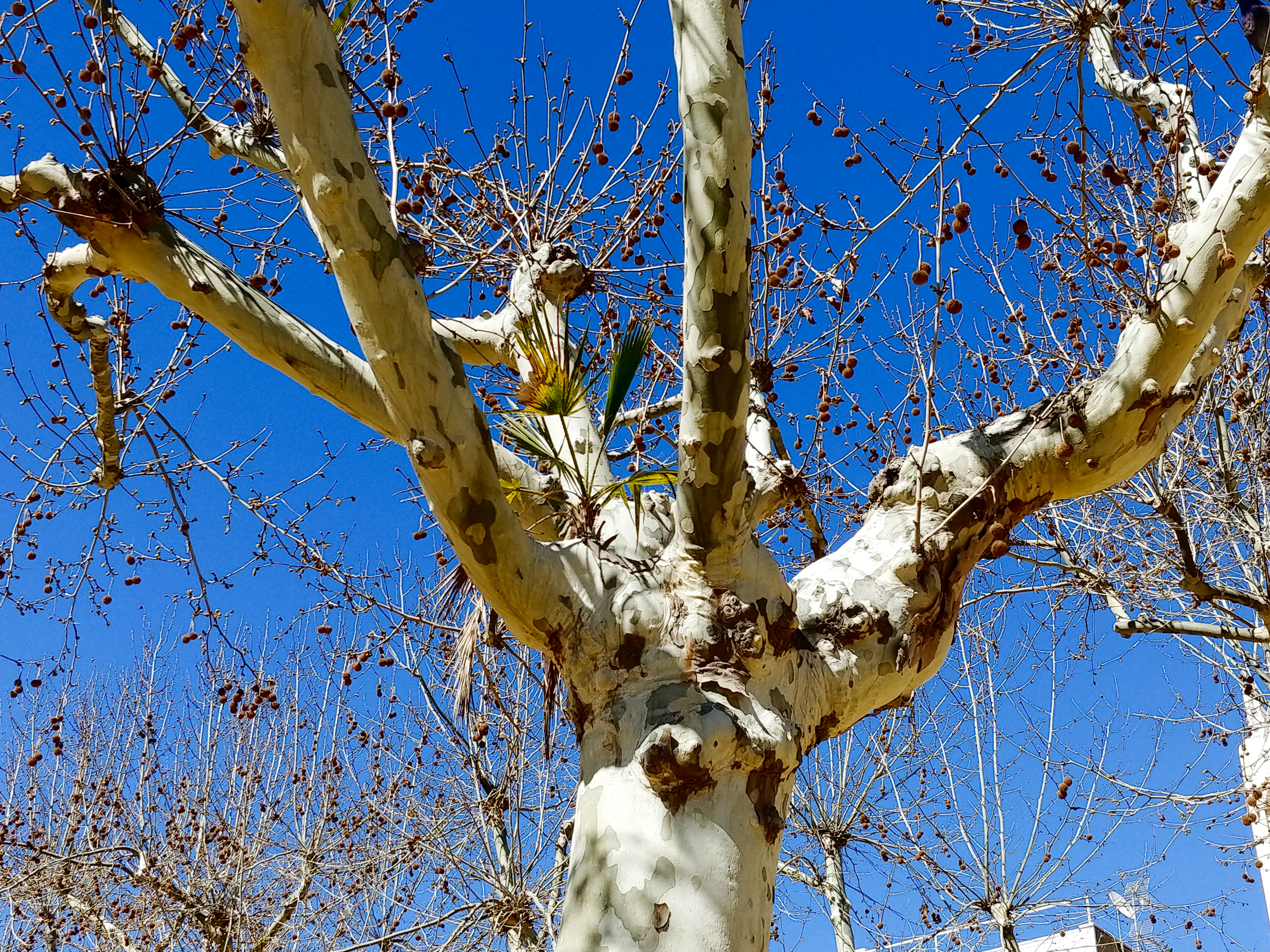 А здесь прямо на платане пальма растет. Если вырастет, в чем я сильно сомневаюсь, ее будут называть "Та самая платановая пальма из Калейи".