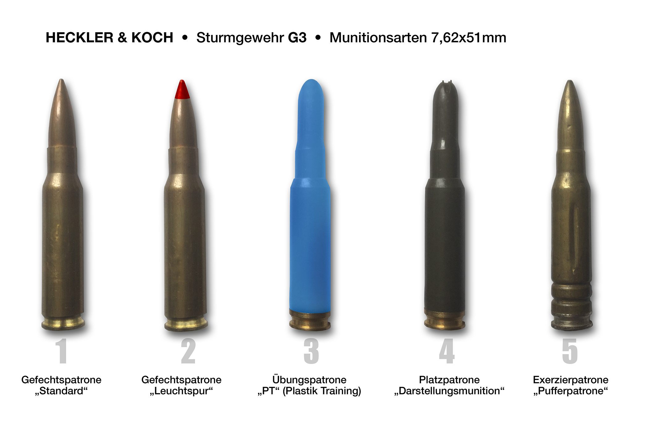 Это был учебно-тренировочный патрон, в отличие от холостого, он уже куда-то попадал, стоил дешево, но не имел большой убойной силы. Сейчас кстати, для подобных задач используются пластиковые пули - вот на фото Nr.3, тренировочный патрон 7,62 Бундесвера.