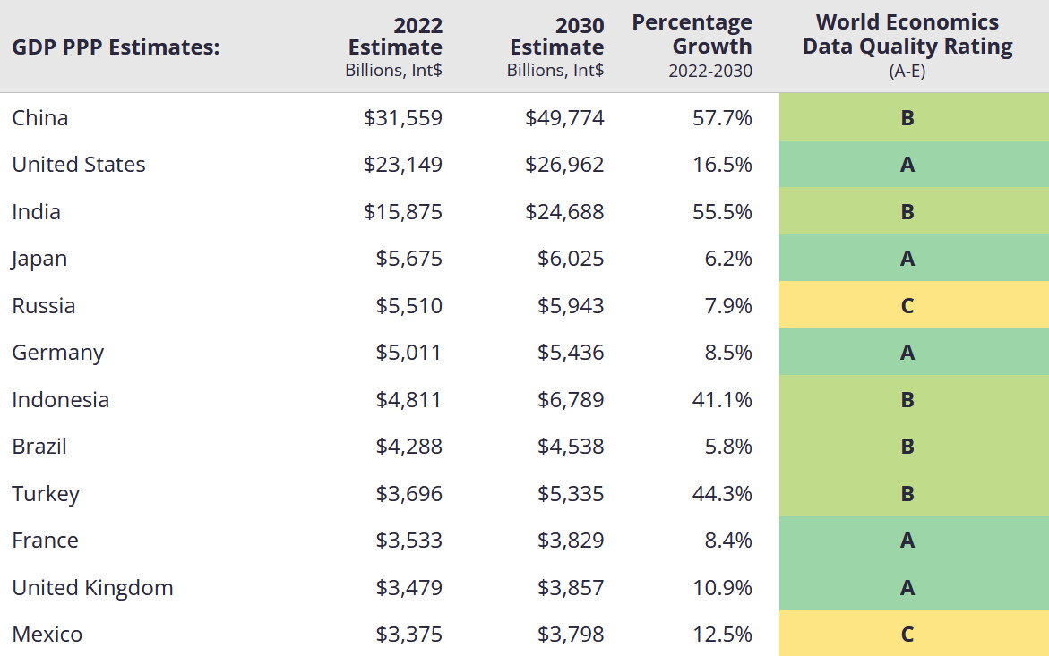 Согласно исследованию World Economics, первое место за 2022 год занимает Китай, ВВП которого оценили в $ 31,559 млрд. В первую пятерку также попали США ($ 23,149 млрд), Индия ($ 15,875 млрд) и Япония ($ 5,675 млрд). ВВП России оценили в $ 5,51 млрд.