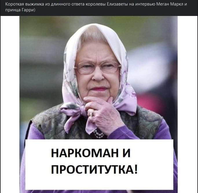 Ну так звиняйте-с. Меган Маркл это воплощенный образец "повесточки", которая лезет изо всех щелей. Вон уже и до королевской семьи добралась. Сами посмотрите: истеричная цветная дамочка, которая вышла замуж за принца по большой любфи и шантажирует окружающих самоубийством, так как ей что-то там было не по нраву. Фактура-то какая!