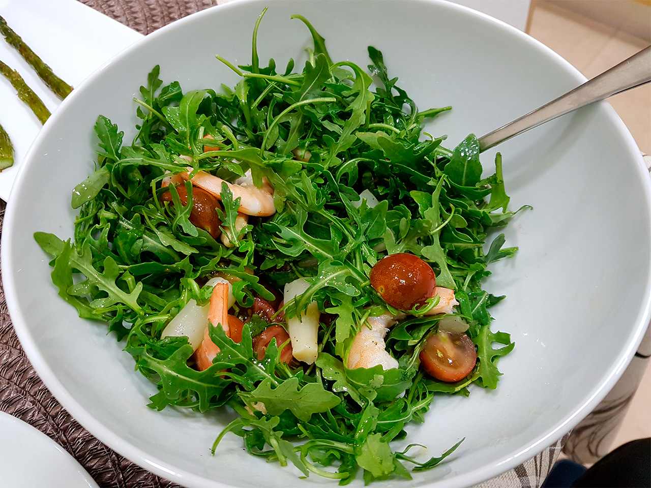 В субботу можно себе позволить оттянуться на ужин. Руккола, помидорки, вареные креветки, консервированная спаржа, соль, перец, оливковое масло. И бутылочка Enuc Priorat. Гуляем!