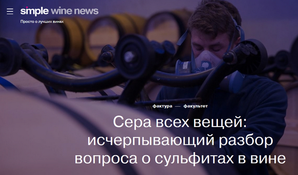 В издании Simple познавательная статья "Сера всех вещей: исчерпывающий разбор вопроса о сульфитах в вине". Что такое сульфиты, зачем они в вине, откуда появилось идиотское требование писать на винных этикетках "Содержит сульфиты" (это все равно что на газировке писать "Содержит углекислый газ"), болит ли голова от сульфитов, ну и так далее. А то даже среди моих знакомых встречаются люди, которые говорят что-то вроде "Я не могу вино с сульфитами пить, у меня потом от этого голова болит". И им бесполезно объяснять, что голова у них болит от того, что они выдули три бутылки в одно лицо, а потом еще и карамелькой заели - вот карамелькой и потравились.