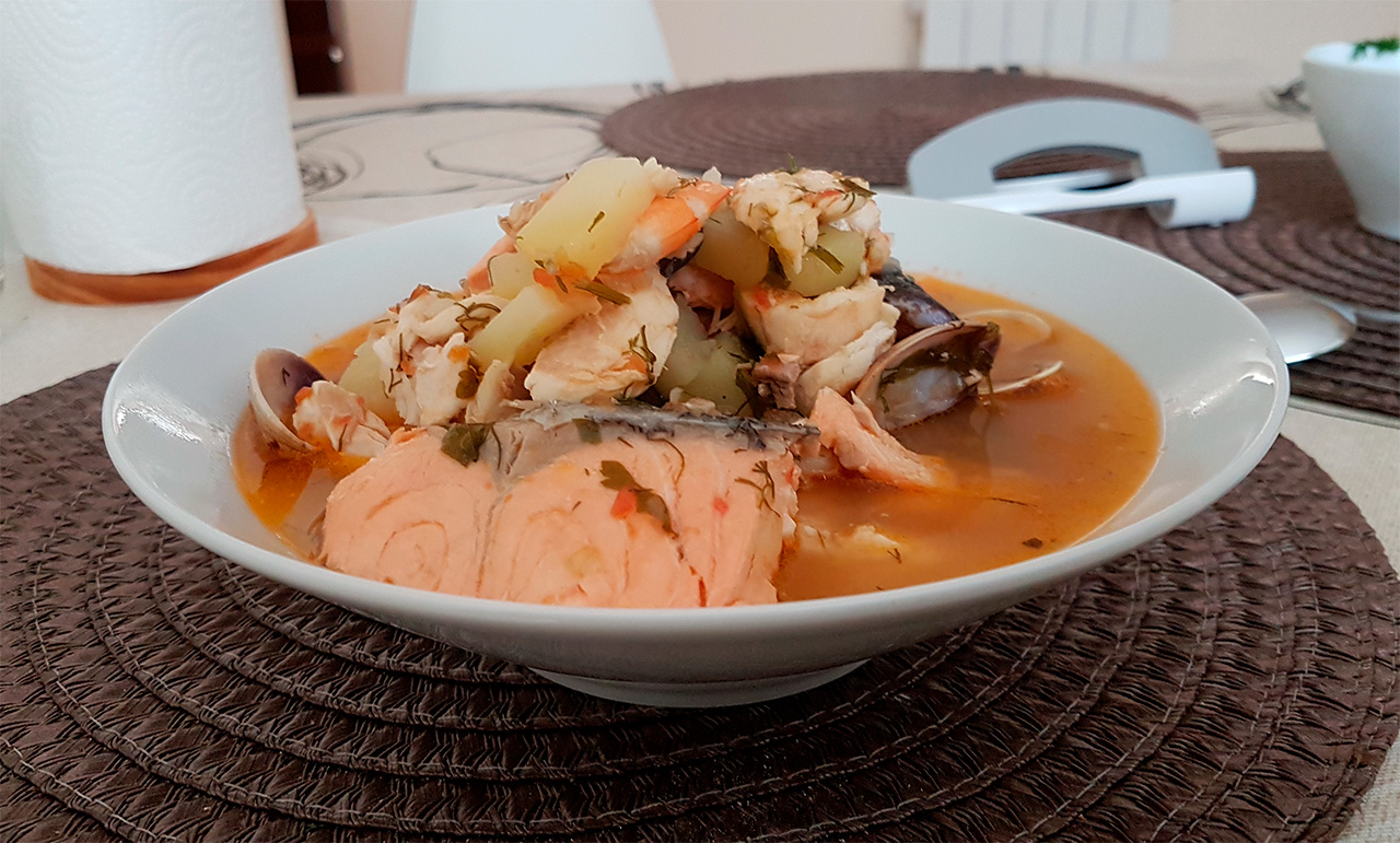 Так это же не я его готовлю, жену надо спрашивать. Но вроде там все просто: сначала отваривается рыба, потом туда добавляется картошка и остальные морепродукты, довариваются. И все.