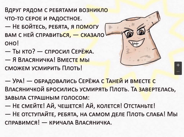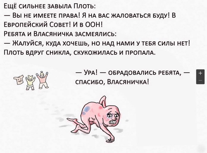 Особенно опроспорадовал: "О да! #Мы_Власяничка давайте причинять детям дискомфорт, ибо Яхве любит страдания! Нужно лешить детей карманных денег и отдать их на строительство храма. Радость жизни - грех, если она исходит не от бога! Согласны?"