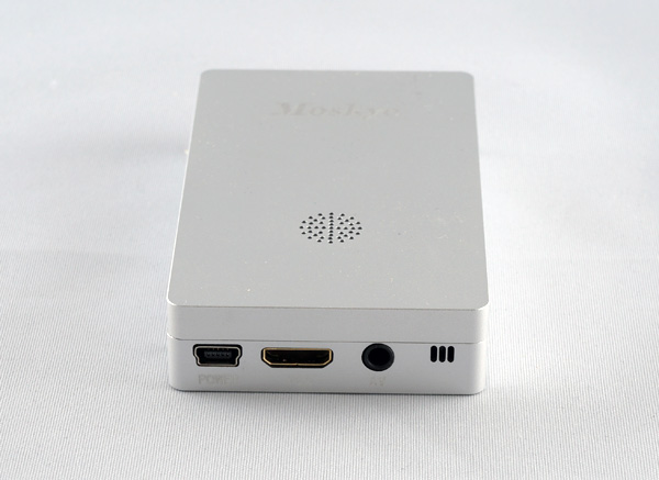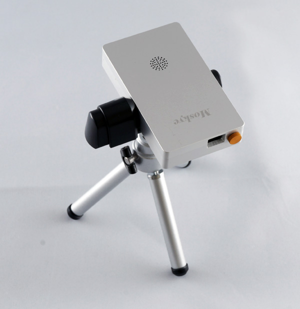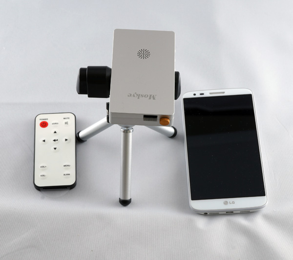 Сам проектор - размером со смартфон. Работает на технологии DLP, световой поток 20 Люмен, разрешение 1024х768, контраст 2000:1.