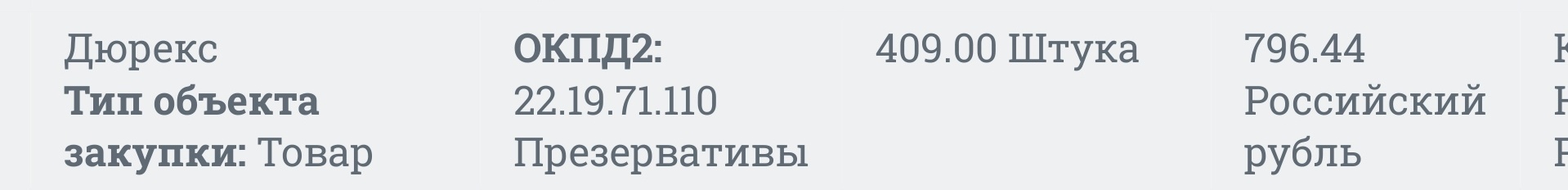 Предприятию понадобились 574 упаковки презервативов Durex, 490 презервативов Contex, 337 «Гусарских», 346 презервативов «Любить по-русски» и 559 резиновых изделий «Неваляшка. Шашка-невидимка», говорится в технической документации тендера. В наименовании последнего товара, видимо, вкралась опечатка: презервативов с таким названием ОМ найти не удалось, однако существуют кондомы с названием «Неваляшка. Шапка-невидимка». (Отсюда.)