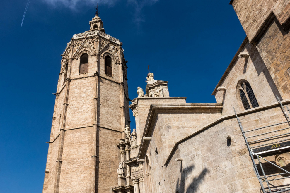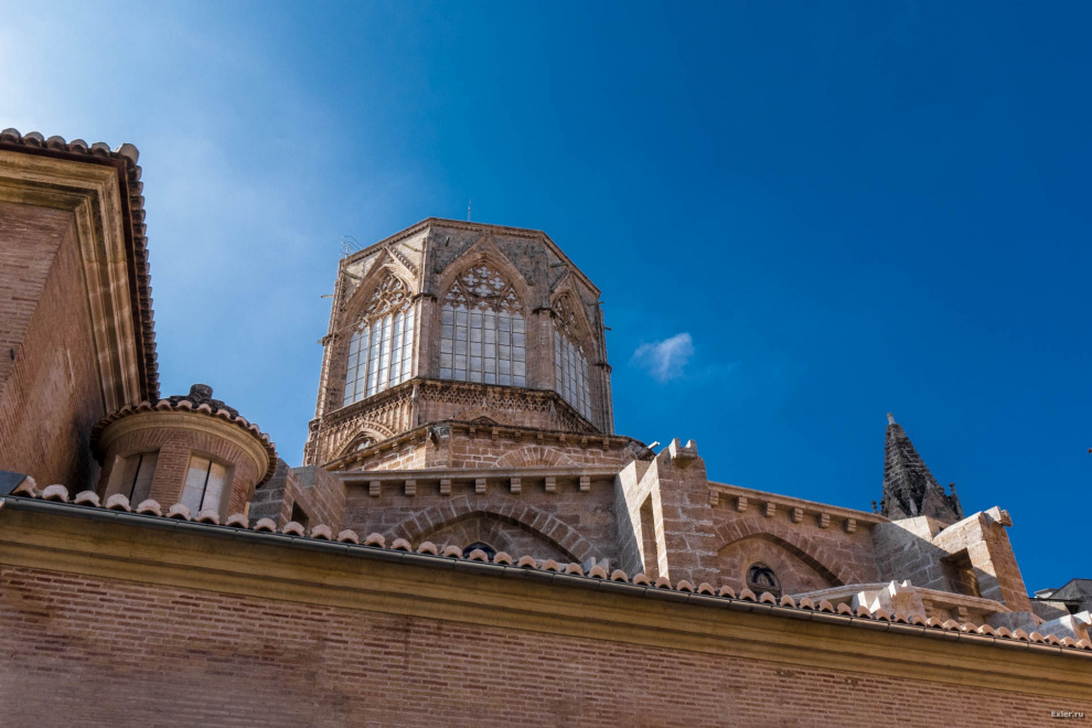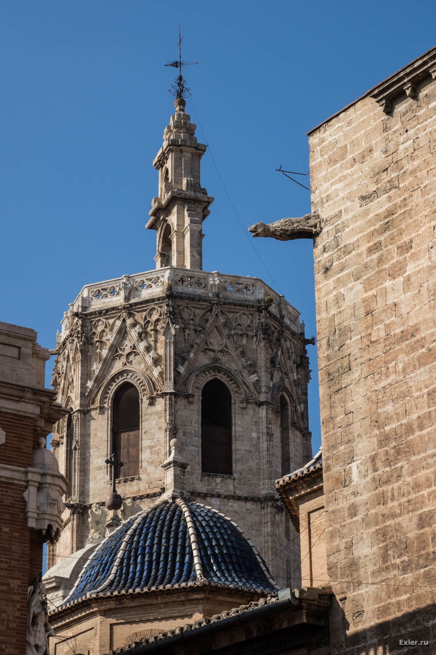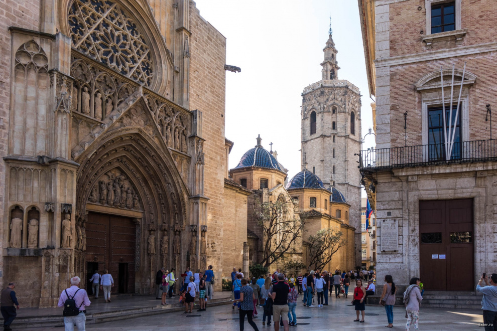 На заднем плане - соборная колокольня Мигелете (Miguelete) или Микалет (Micalet). Название ее происходит от самого большого из 12 колоколов звонницы колокольни. Туристы могут подняться на колокольню по винтовой лестнице - там всего-то 207 ступенек - и осмотреть окрестности.