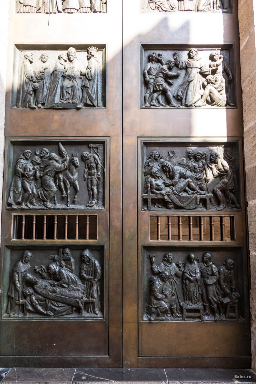 Главный вход в собор - портал Пуэрта-де-лос-Йеррос (Железные врата). Это наиболее поздний портал собора. Его начал строить немецкий архитектор Конрад Рудольф в 1703 году, а потом испанские скульпторы заканчивали портал в 1713 году.
