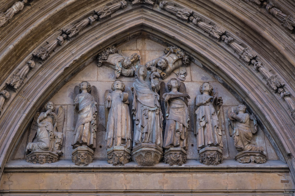 В центре, на тимпане портала - фигура Девы Марии с младенцем на руках в окружении ангелов.