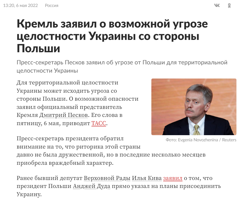 "То, что из Польши идет весьма и весьма враждебная риторика в последние месяцы - она традиционно не была дружественной, но в последние месяцы она стала враждебной, и то, что для территориальной целостности Украины из Польши может исходить угроза - это тоже очевидные факты", - сказал он журналистам в пятницу. (Отсюда.)