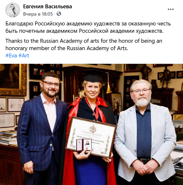 Бывшая фигурантка дела «Оборонсервиса» и экс-чиновница Минобороны Евгения Васильева стала почетным академиком Российской академии художеств, о чем сама Васильева сообщили в своем Facebook.
