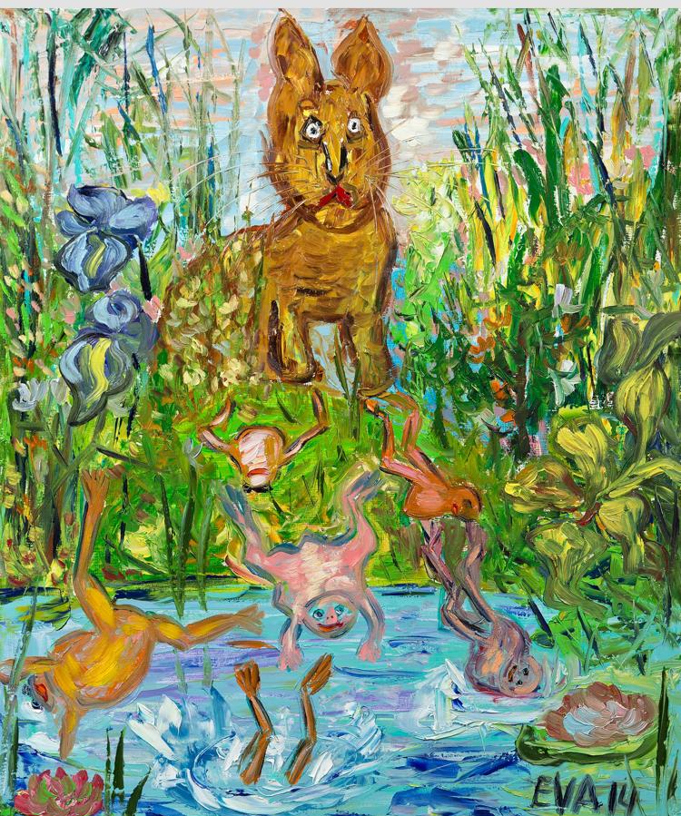 Полоумный заяц на пруду - это же сиквел к картине Ван Гога "Ирисы": взгляд на пруд с другой стороны из неизданных эскизов мастера. До недавнего времени все думали, что это - просто поле, но, оказывается, если кущи раздвинуть, то там лягушки и заяц прятались. Вот она и раздвинула всё, что смогла. Лягушки от такого развития событий, понятно, убежали, ну а заяц, логично, прифигел слегка. Так что, воистину, талант!