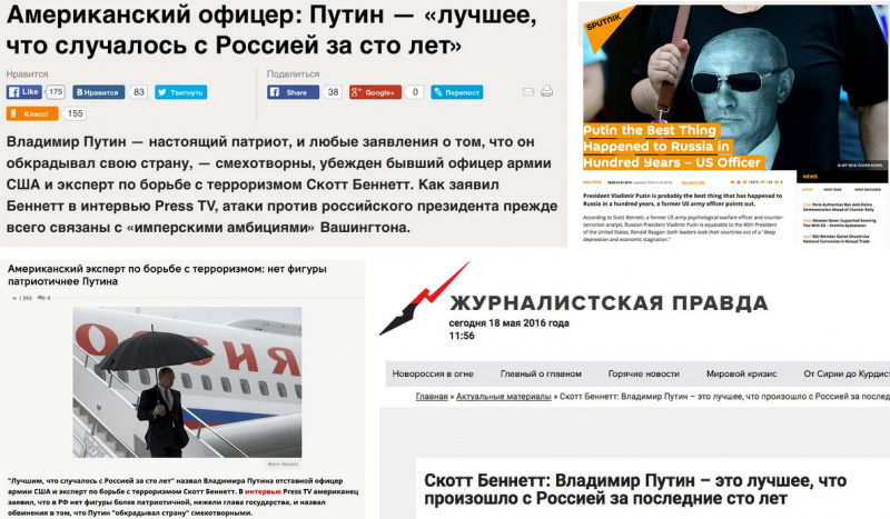 На самом деле Беннетт — никакой не ветеран и тем более не эксперт по борьбе с терроризмом, а жулик с богатой фантазией. В 2011 году Беннетт был приговорён к трём годам заключения за то, что успешно выдавал себя за кадрового офицера и даже получал жалование и квартиру на военной базе во Флориде. В конце концов Беннетта в нетрезвом виде и с багажником, полным оружия, задержали на КПП. Судья, оглашавшая приговор, сказала, что Беннетт “очевидно, не понимает разницы между правдой и собственными выдумками, в которые сам верит”. Беннетту дали три года, в 2014 году он вышел — и тут же начал маячить на страницах Sputnik и в эфире RT в качестве “эксперта по борьбе с терроризмом” и “телегами” про Путина, который лучшее, что случилось с Россией за последние 100 лет.