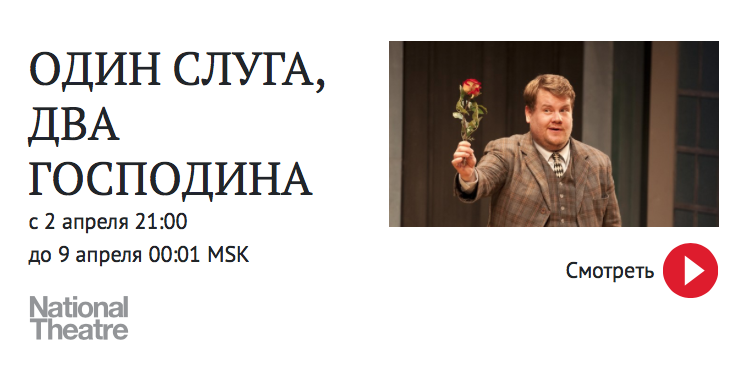 На TheatreHD/Play с 21:00 2 апреля по 9 апреля (время московское) доступен гомерически смешной спектакль «Один слуга. Два господина» с блистательным Джеймсом Корденом в главной роли. Также в апрельской афише NT спектакли «Джейн Эйр», «Остров сокровищ» и «Двенадцатая ночь».
