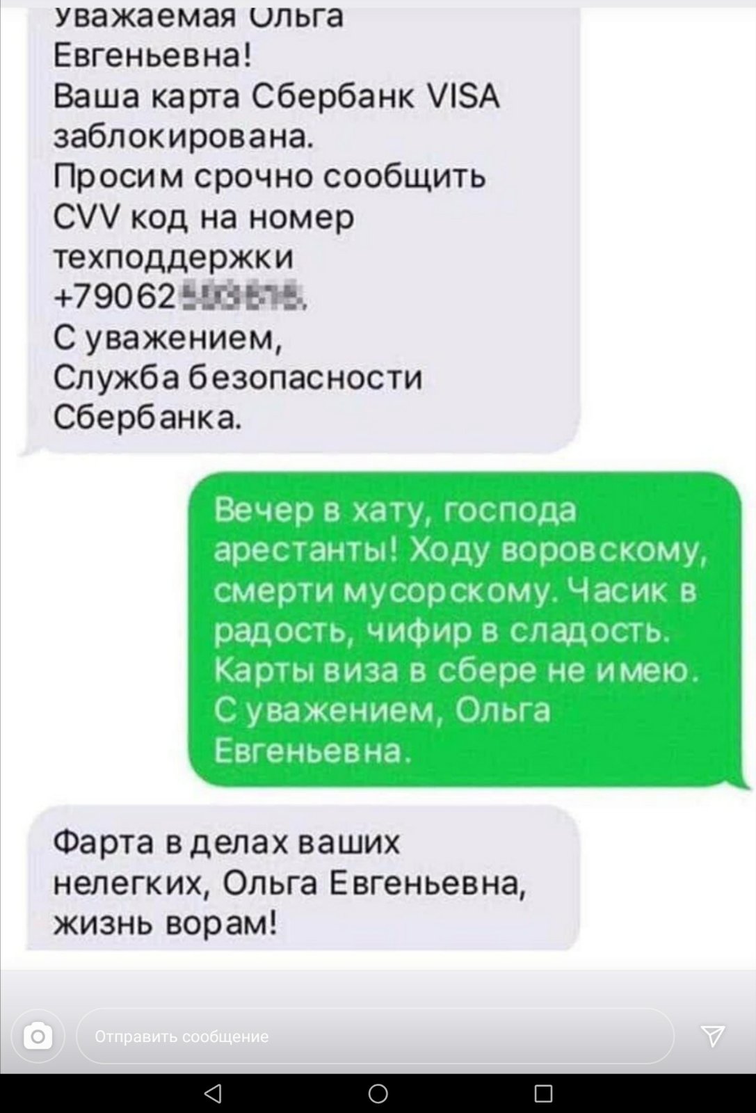 Намного реже звонят как бы из банков, с которыми у меня есть какие-то взаимоотношения, и при этом называют правильные ФИО (информация из банков, как известно, сливается бурным потоком). И тут уже, конечно, можно повеселиться, но у меня все как-то не складывается: звонят, заразы, когда я реально сильно занят, и мне совершенно не хочется тратить время на то, чтобы развлекаться с мошенниками. Вот недавно позвонили, правильно произнесли ФИО, но я был в полном завале, поэтому на вопрос, переводил ли я крупную сумму денег Егорову Сергею Михайловичу в Набережные Челны, коротко ответил "Хуячечная" и повесил трубку.