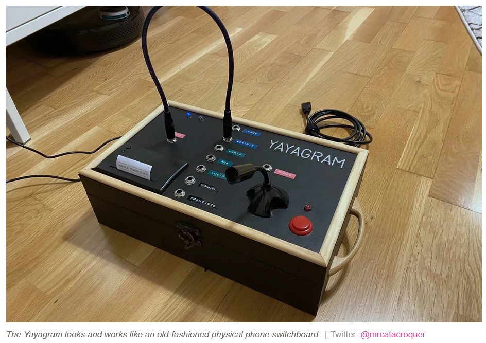 Инженер Мануэль Лусио Далло создал для своей 96-летней, плохо слышащей бабушки, чьи возможности общения были резко ограничены во время коронавирусного дурдома, "теплый ламповый", а именно аналоговый Телеграм, представляющий собой нечто вроде старого телефонного коммутатора. Назвал он его "Яяграм" (Yaya - ласковое прозвище его бабушки на испанском.)