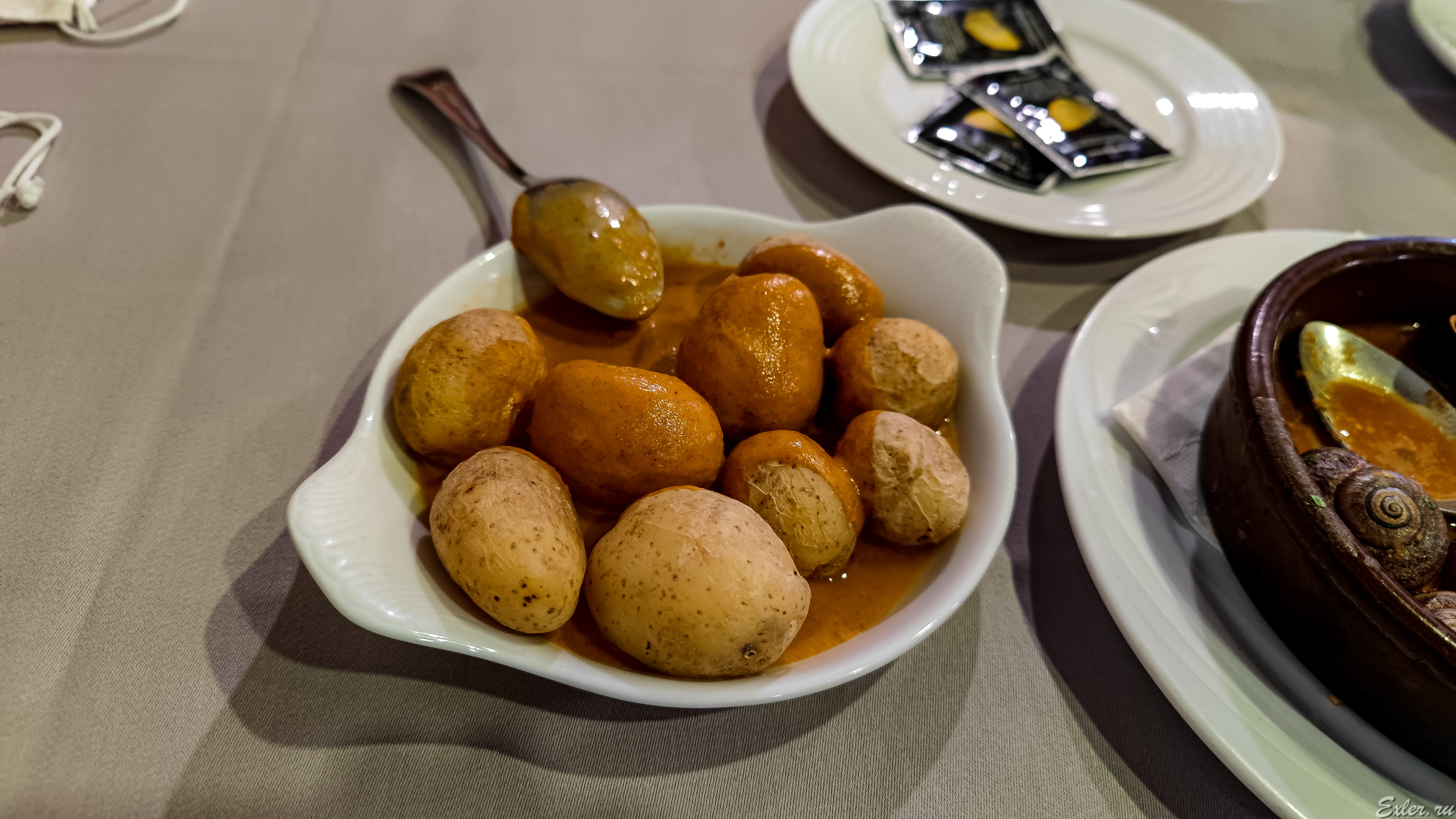 Ну и заказали, конечно же, знаменитую "сморщеную картошку" (papas arrugadas), которая упоминается во всех путеводителях - мол, ангельское блюдо. Это обычная вареная молодая картошка. У обычной молодой вареной картошки нередко после варки шкурка слегка сморщивается. И тут нужно ловить момент - назвать обычную молодую вареную картошку "Знаменитая сморщенная картошка Канарских островов", после чего зарядить на нее цену в три раза (вот эта порция стоила €9,5 - 800 рублей).