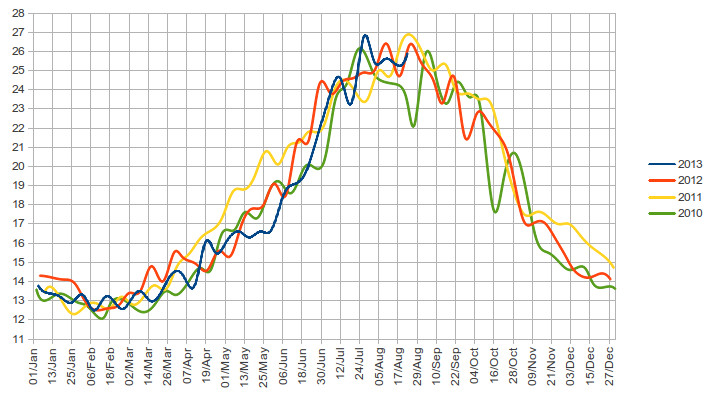 Так вот, единственный разумный ответ на вопрос, купаются ли у нас в мае или как там у нас водичка в июне - это демонстрация вот такого графика, который любезно подготовил Олег Шевелев. Вот после этого все будет предельно понятно. Табличка составлена по результатам ежедневных замеров температуры в течение последних нескольких лет.