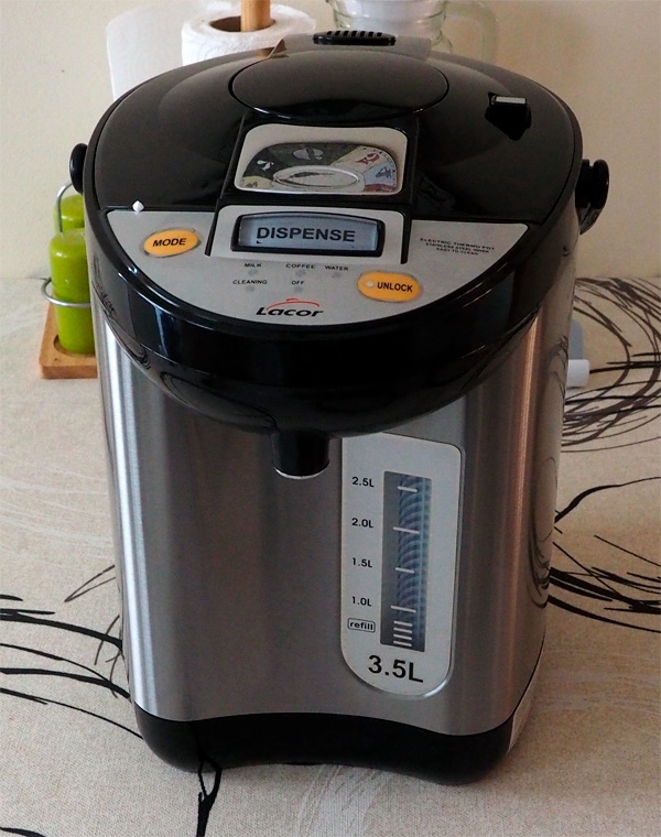 В России этих термопотов - как грязи. Залез в испанский Amazon - поначалу вообще толком ничего не нашел. Потом более или менее выяснил, по каким ключевым словам искать, ну и в результате нашел один китайский вариант на 4 литра, который поставляет чисто испанская компания под называнием Posylka-shop, а потом нашел более интересный вариант на 3,5 литра (мне чем меньше, тем лучше, потому что воды требуется немного) от известной европейской компании Lacor - термопот Lacor 69473, который поставляет немецкое отделение Amazon.