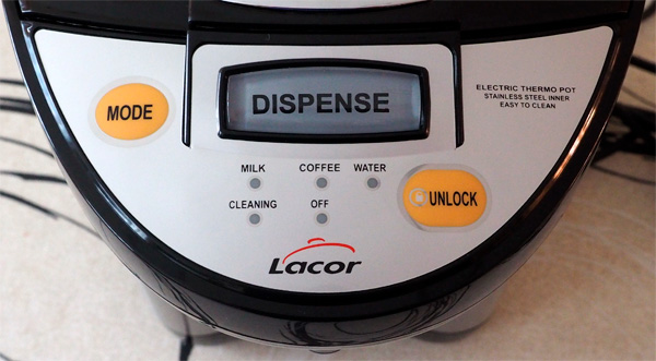 Устройство может нагревать молоко, кофе и воду (для каждого вида - своя температура). У диспенсера, через который наливается жидкость, есть защита: при нажатии кнопки подачи жидкости DISPENSE ничего не происходит, сначала надо нажать кнопку Unlock, которая через 10 секунд после отпускания кнопки DISPENSE автоматически заблокируется снова.