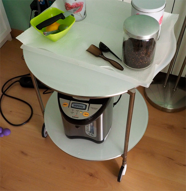 Я его поставил на нижнюю полку чайного столика - использовать вполне удобно. Красота!