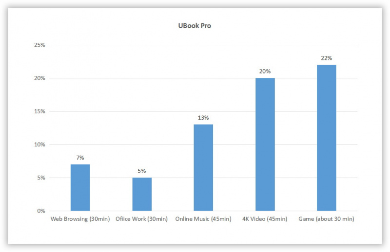 По завершении всех тестов UBook Pro сохранил 33% заряда. Согласно гистограмме, заряда батареи может хватить на 10 часов автономной работы с документами или на 7 часов просмотра веб-страниц. Очевидно, что емкости батареи мощностью 38 Втч может хватить для работы устройства в течение целого рабочего дня. Кроме того, благодаря быстрой зарядке PD можно зарядить батарею, не прерывая работу.