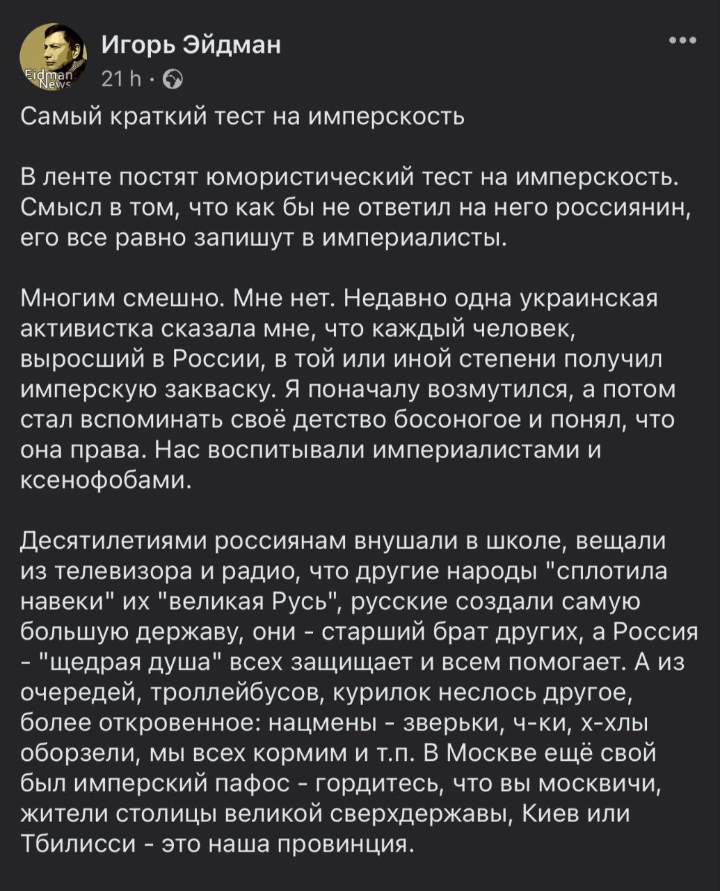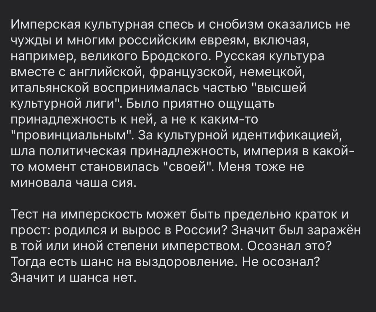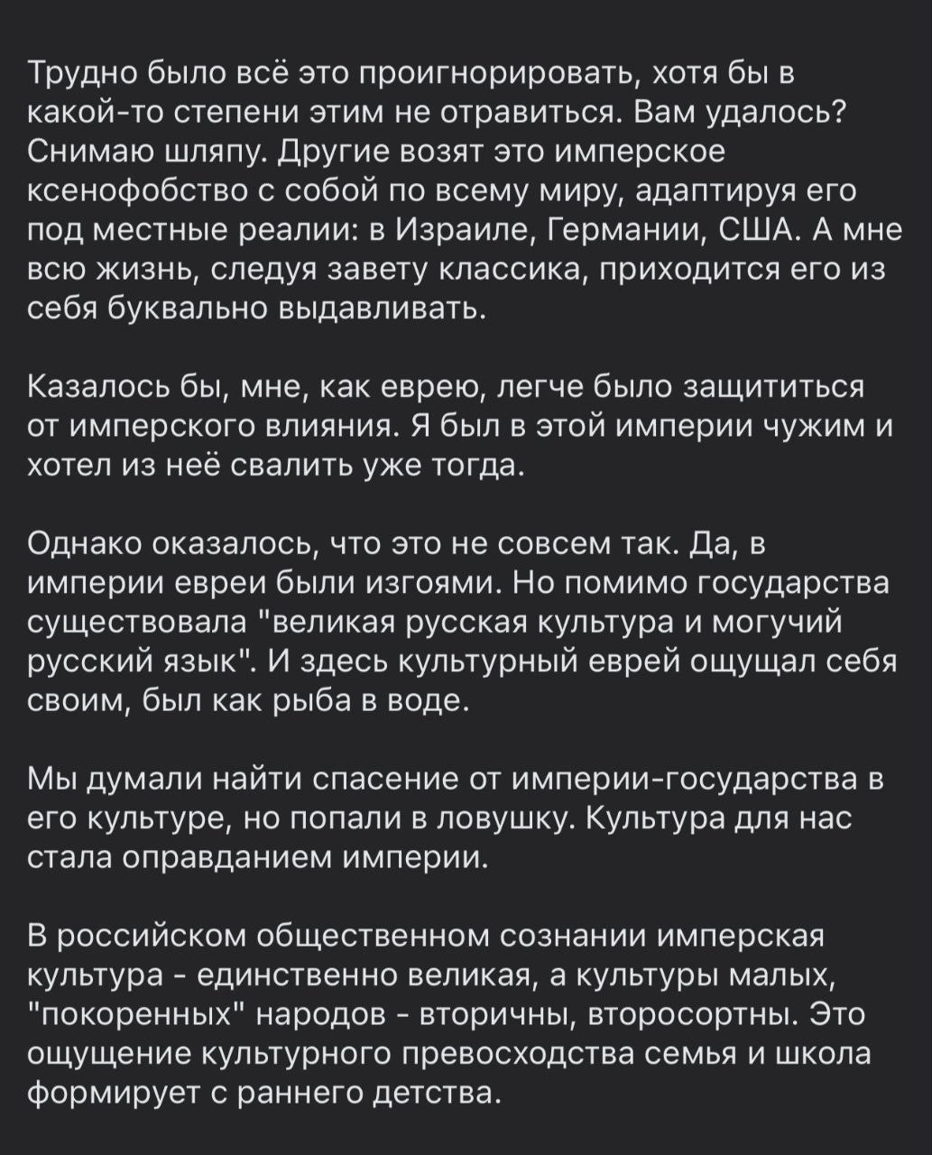 Ну ноги понятно откуда растут. У любого каждого девятого россиянина из десяти, покинувшего родную говень, остается фантомное желание патриотизма. Надежда, что рано или поздно этот морок сгинет, россиюшка засияет и они все перестанут прятать красный паспорт, имея другой красный (или синий). Не все примерили на себя опыт советской политэмиграции, когда надо было рубить наотмашь. И в связи с этим многие идеализирут навального, потому что если не он, то кот. А навальный - он как ни крути, а таки вполне себе имперец. Вот и появляются такие вот памфлеты, что имперец - это не имперец, и воообще - на полшишечки имперцем быть не зазорно.