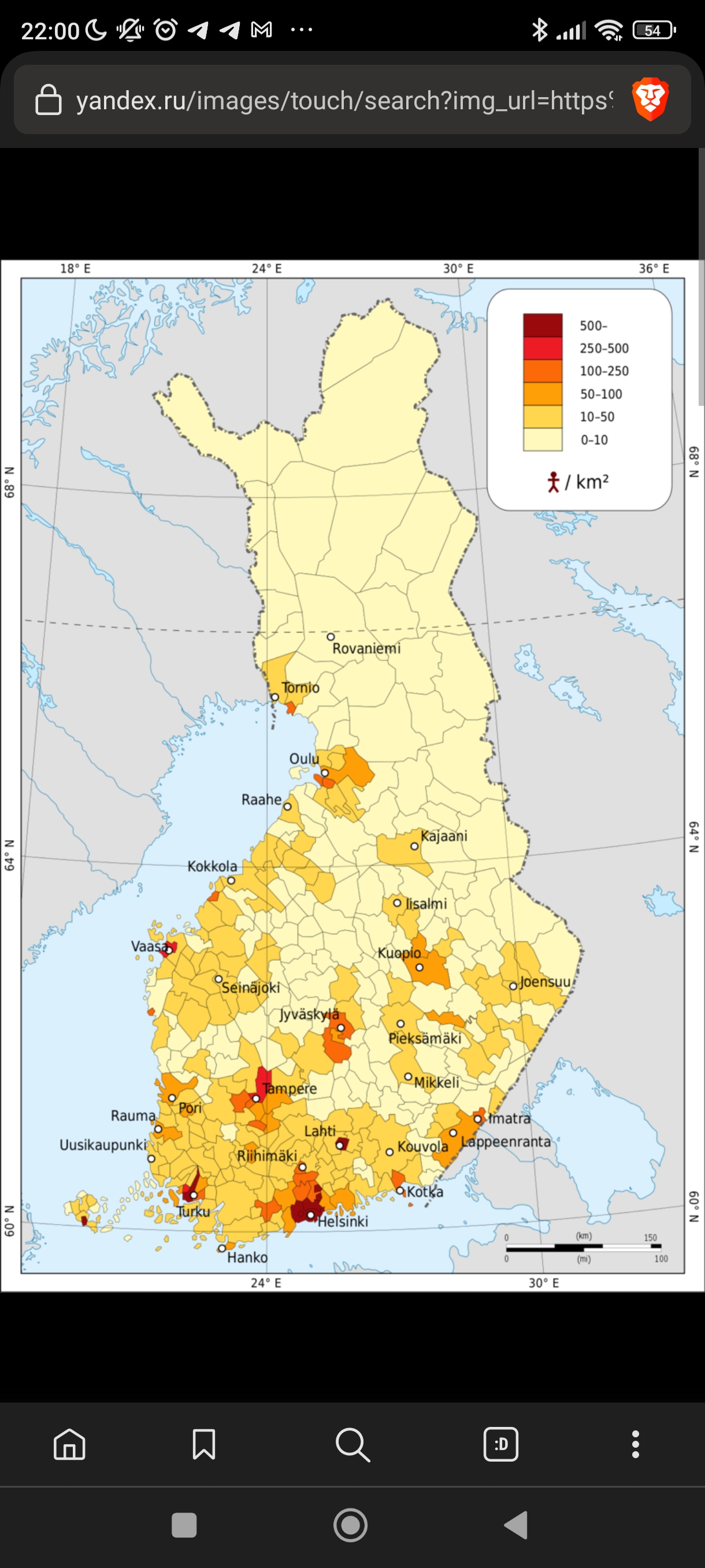 Ну и вот карта плотности населения Финляндии - ровно то, о чем я говорю - хорошая транспортная сеть и скученность населения вокруг городов и междугородних дорог.