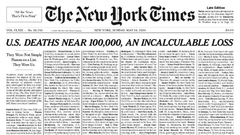 И почему только тысяча? А остальные 99 тысяч, которые считаются жертвами коронавируса, не были достойны того, чтобы их имена назвали на страницах The New York Times? Почему The New York Times не сделала специальный стостраничный выпуск с перечислением имен этих людей? Так было бы более пафосно, чем сейчас, я считаю.