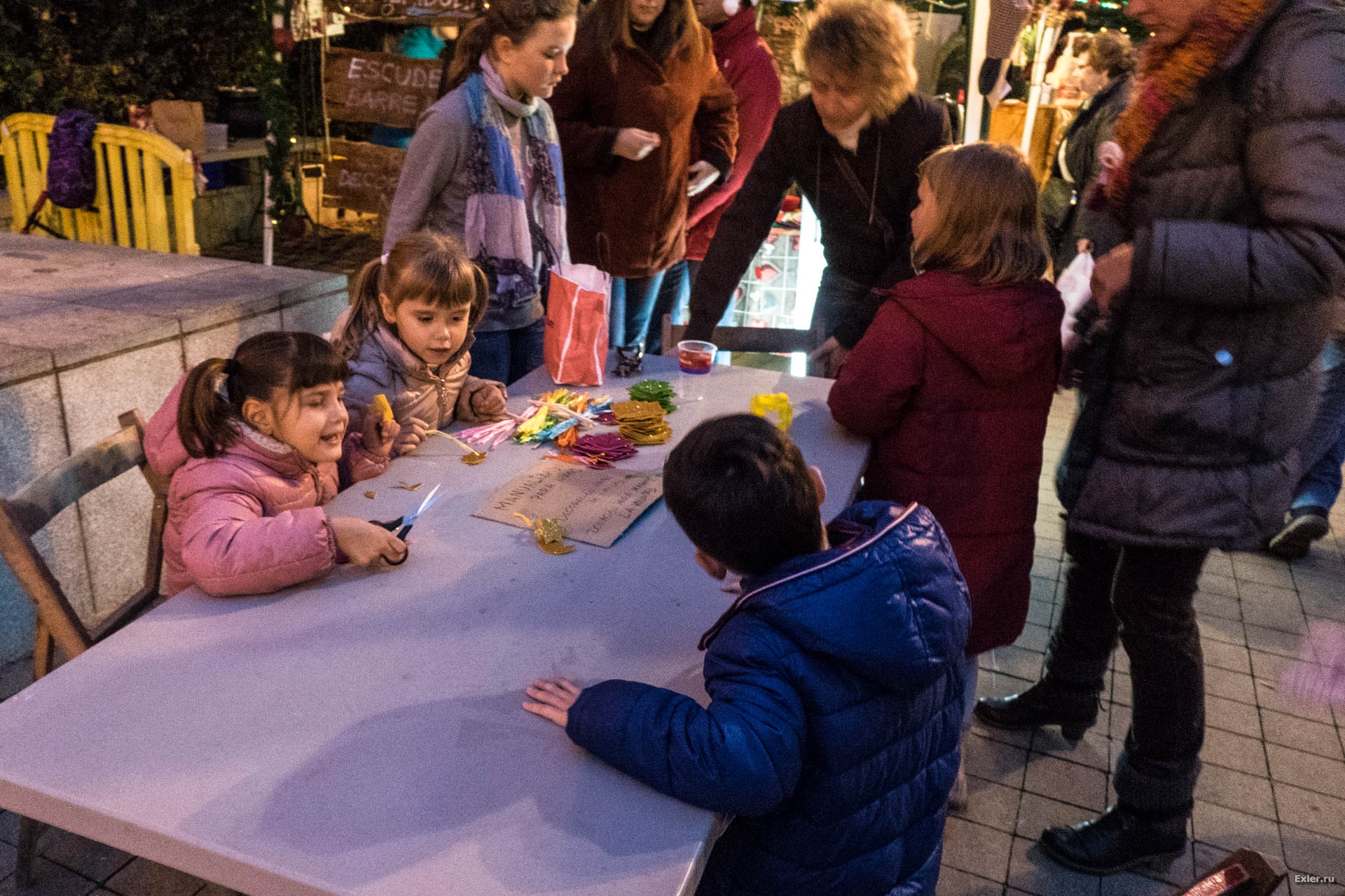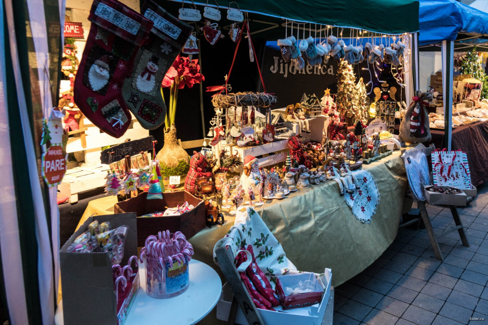 Площадь перед церковью с ярмаркой. Здесь на нескольких столах продают всякие пончики, булочки, блинчики, сосиски, горячий шоколад и глинтвейн. Все это делается своими руками, продается по цене немного выше обычного, однако 40% выручки все продавцы отдают на определенный благотворительный проект - это традиция такая. В выходные местные школьники часто торгуют самодельной выпечкой - и там вся выручка идет на благотворительность.