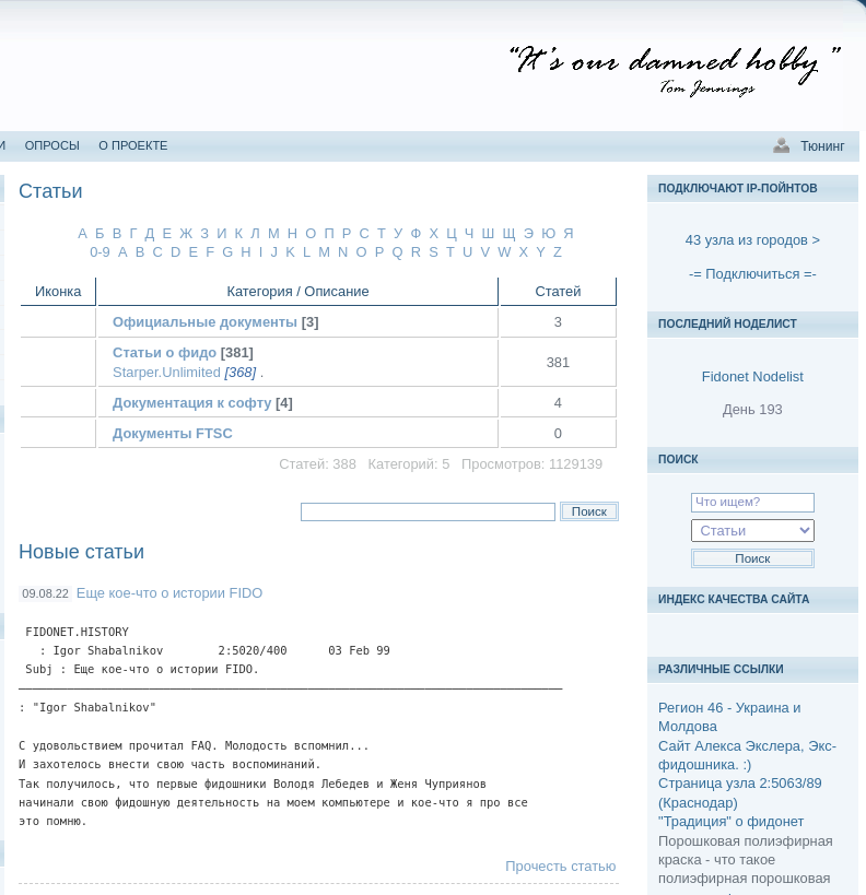 Интересно, много тут фидошников? Я в 1997-м подключился 2:5079. Последний раз почту забрал году в 2006-м