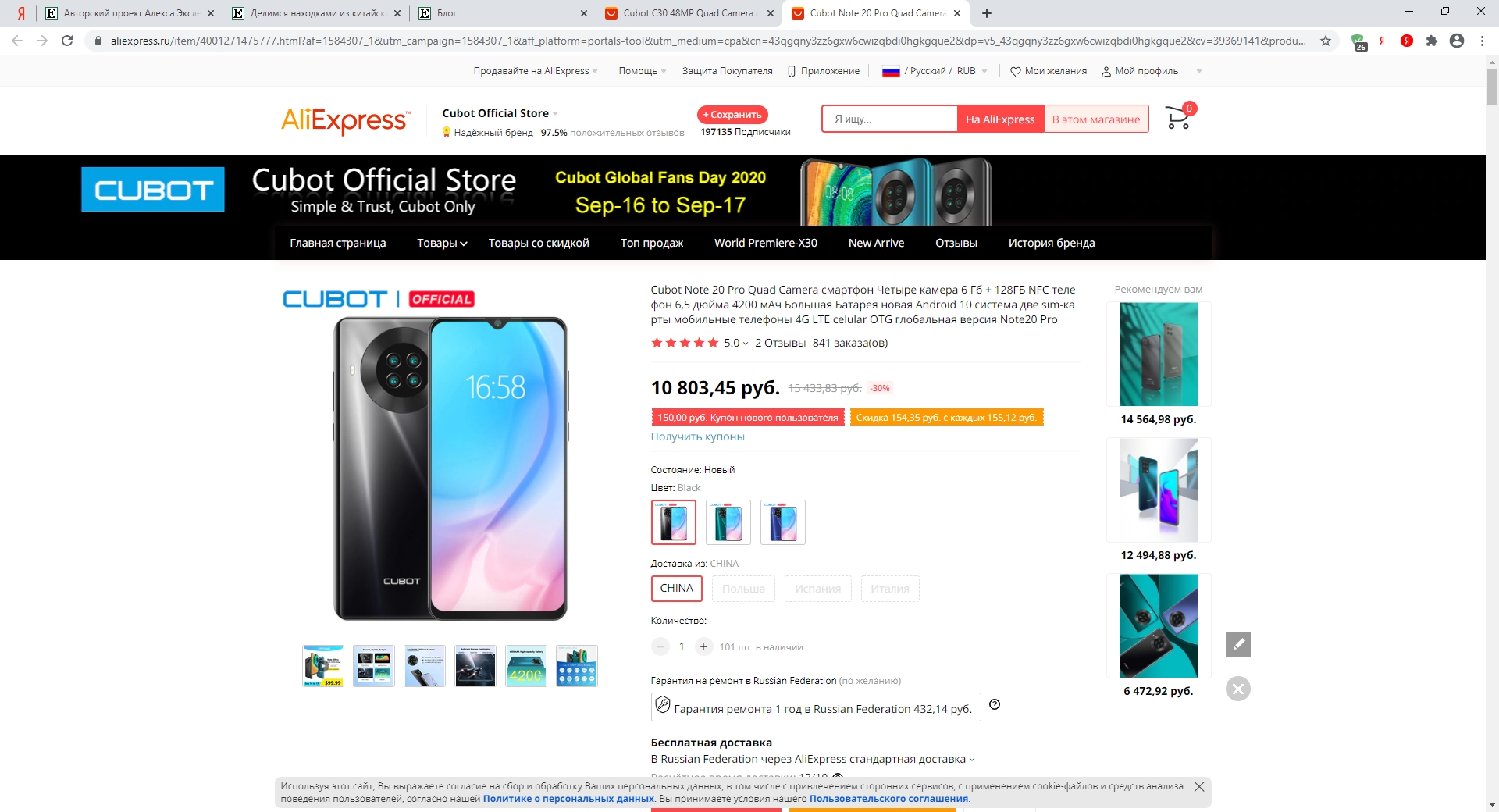 В течение 16 и 17 сентября компания Cubot предоставляет скидки на новую популярную модель Cubot Note 20 Pro с четырьмя камерами и 6/128 ГБ памяти со скидкой можно будет купить всего за $99.99!