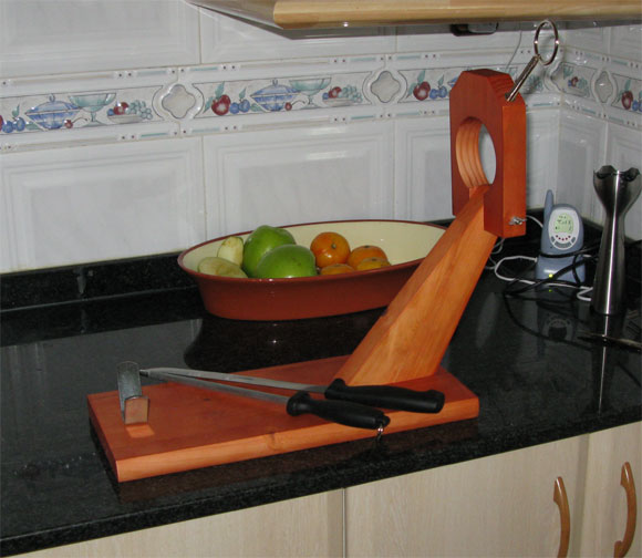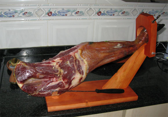 Ладно - купил хамон. Но надо же его как-то есть. Без специальных приспособлений не обойтись, потому что ножка увесистая, жирная, и просто так с ней не совладать. Кроме того, нужен еще специальный ножик - длинный и очень тонкий, чтобы срезать хамон тонюсенькими пластами.
