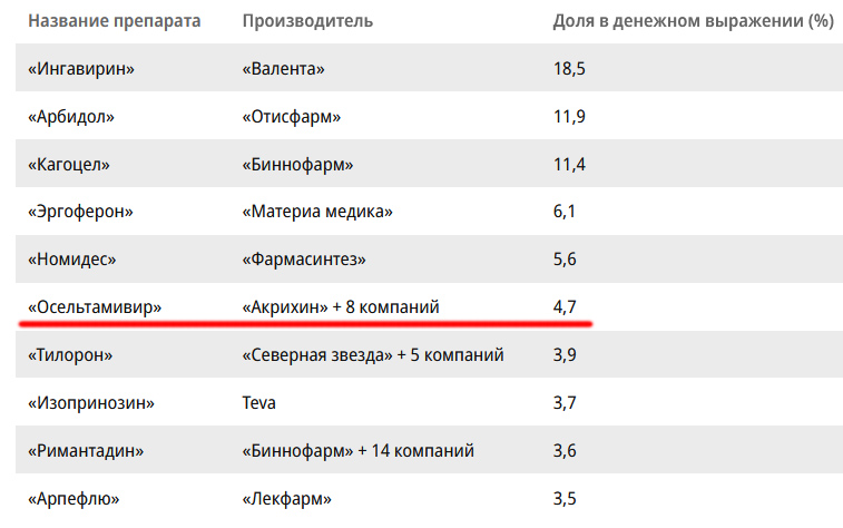 Так вот, чтобы вы понимали. Из десяти самых продаваемых противовирусных препаратов, восемь - ФУФЛОМИЦИНЫ! То есть они не имеют доказанной клинической эффективности по международным стандартам. Из оставшихся двух Римантадин - имел доказанную эффективность, но сильно устарел и теперь к применению не рекомендуется. И только Осельтамивир подтвердил сокращение продолжительности и тяжести гриппа, снижение частоты осложнений и умеренное снижение риска госпитализации, допущен к применению в Европе, США, Японии, также ВОЗ рекомендует для лечения гриппа типа A и B.