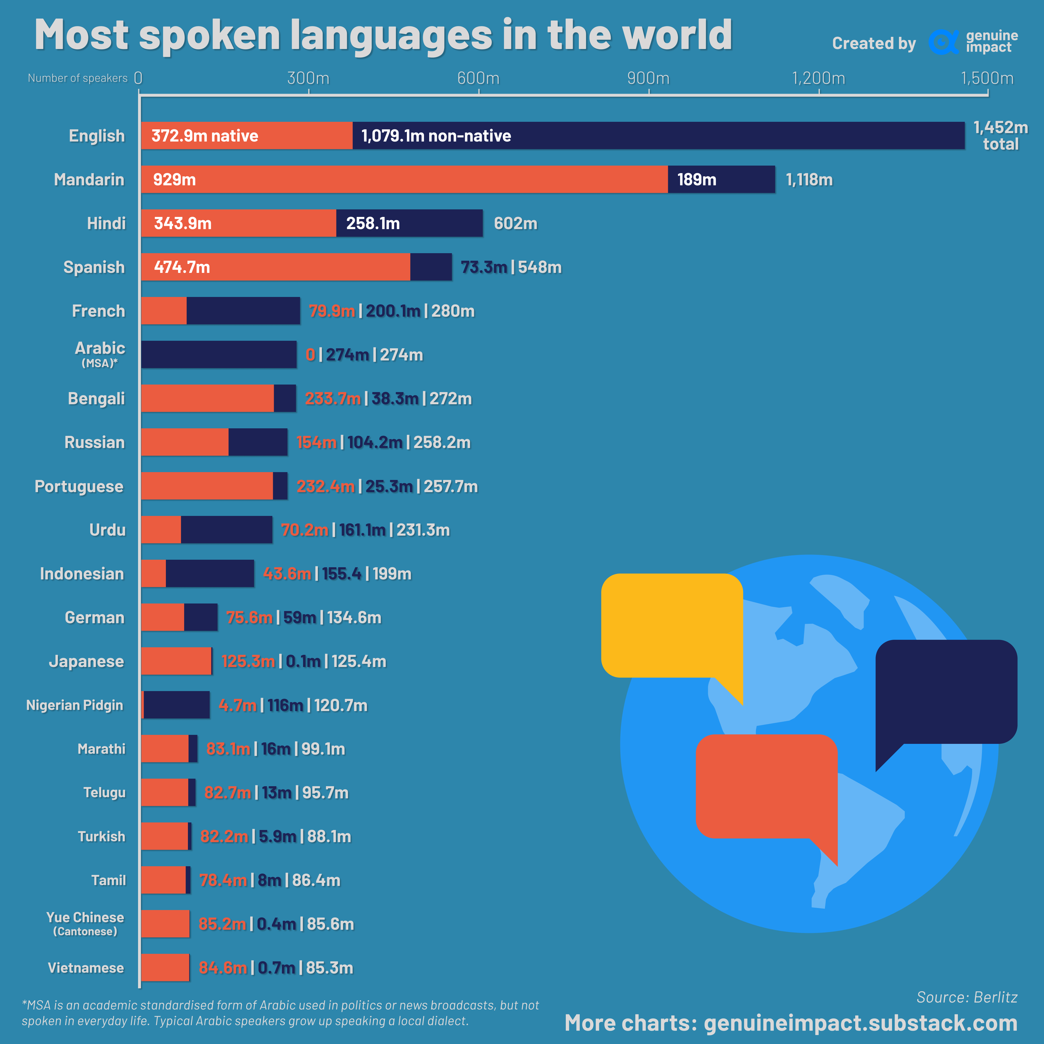 Я тоже так поняла. Т.е. не сколько людей живет в стране, где этот язык - родной, а сколько людей в мире знает этот язык среди прочих.