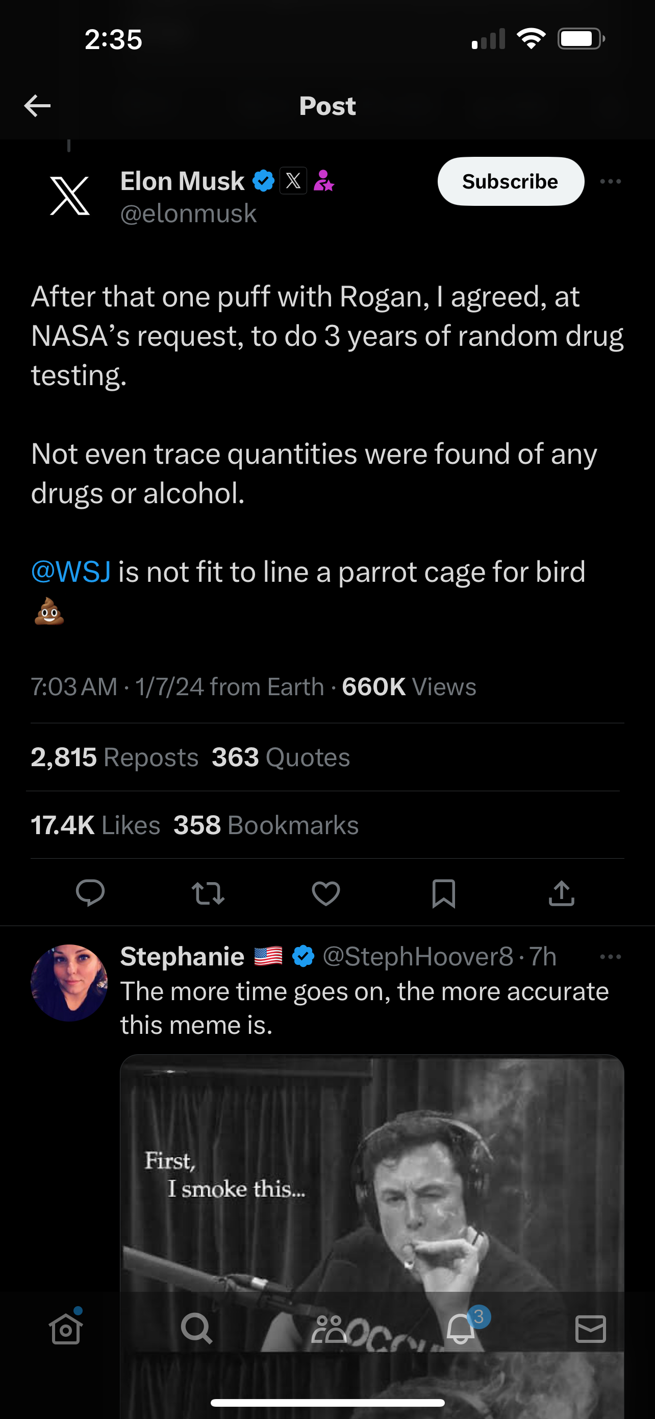 Так что есть все основания предполагать, что аффтар из WSJ получающий оплату за слово просто хайпует, и его утверждения по поводу наркомании Маска - тако же бред как и с акциями.
