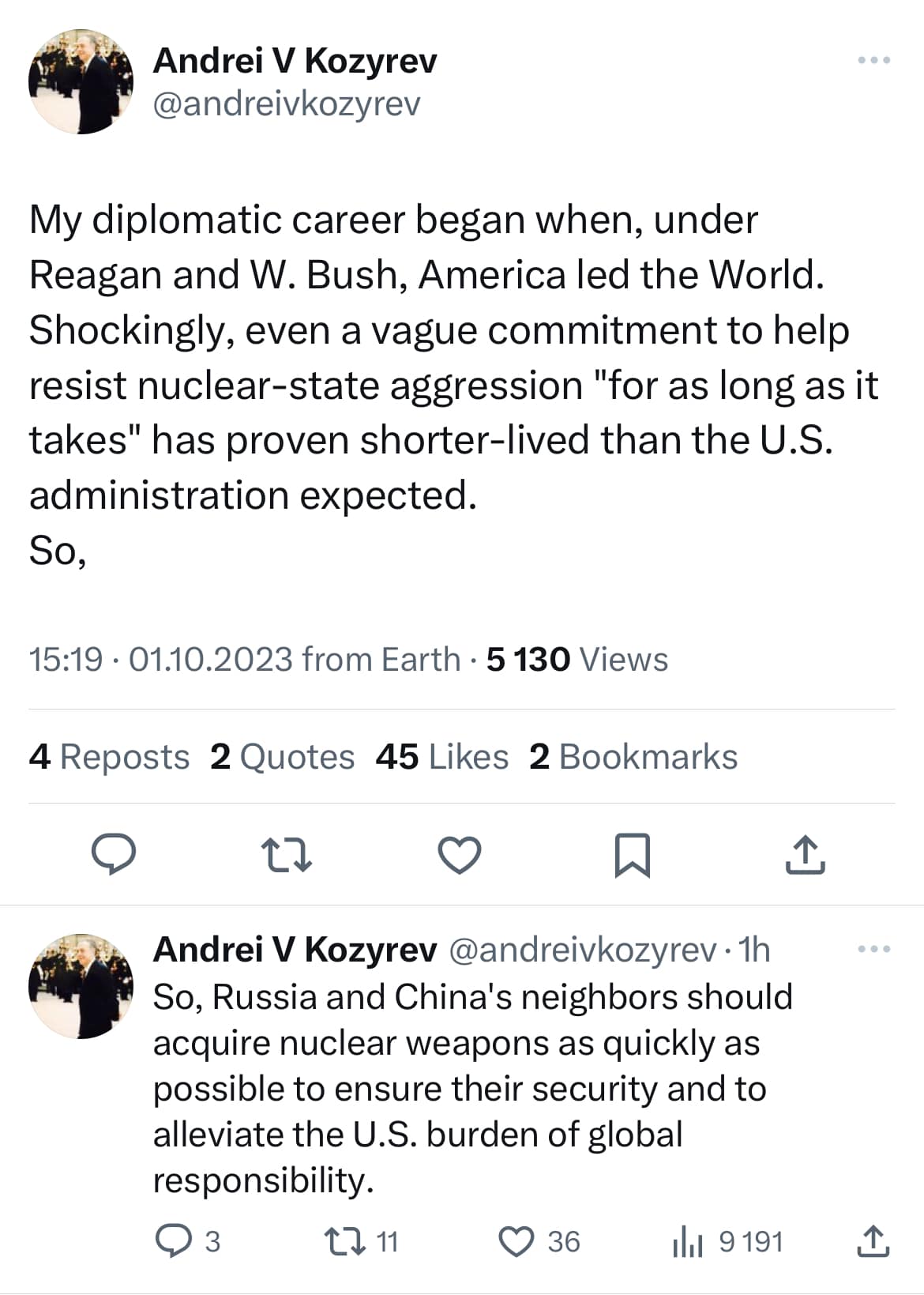 Маска волнуют две вещи. Первая - Маск, как и многие другие люди (прежде всего - политики) на Западе до сих пор боится путинского ядерного шантажа. Да-да, какой-то отморозок десяток лет грозит всему миру ядерным оружием, а мир вместо того чтобы дружно прищучить обнаглевшего гопника, на этот шантаж покупается и пытается этого гопника задобрить. Никому из них и в голову не приходит, что гопника задобрить невозможно. Любые уступки он воспринимает как признак слабости (и в этом он, конечно же, полностью прав), и начинает только еще больше наглеть.