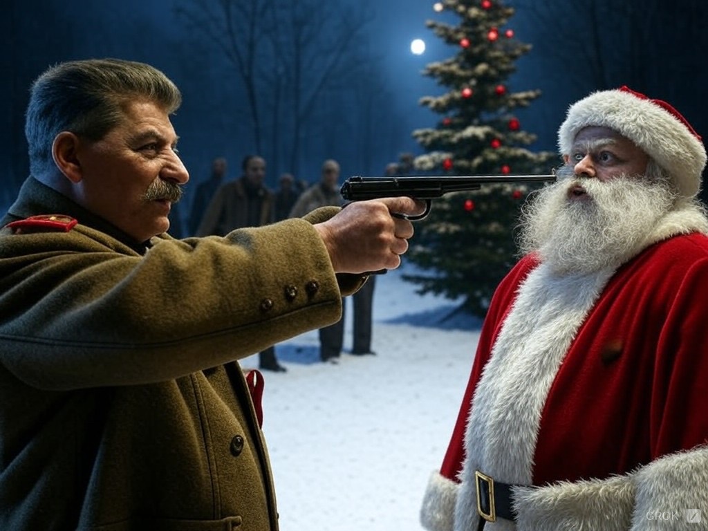 Ну и, конечно, нельзя не прослезиться, глядя на то, как дружно детишки с Дедушкой Морозом и Снегурочкой прогоняют на хер подлого либерала из 30-50-х годов. Трогательная картина, конечно.
