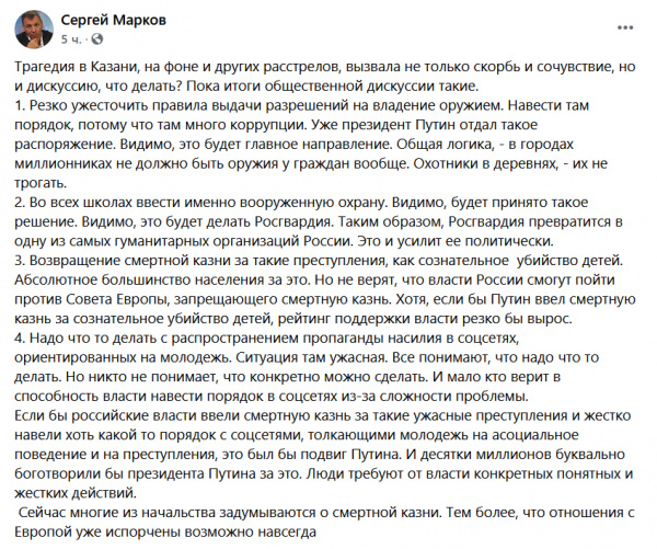 Сирожа Марков о том, кто виноват и что делать. Набор традиционный - резко ужесточить, угуманитарить Росгвардию по самые помидоры, вернуть смертную казнь и всех расстрелять, закрыть нахрен соцсети. Вот тогда десятки миллионов заплачут от счастья и забоготворят Путина во все места.