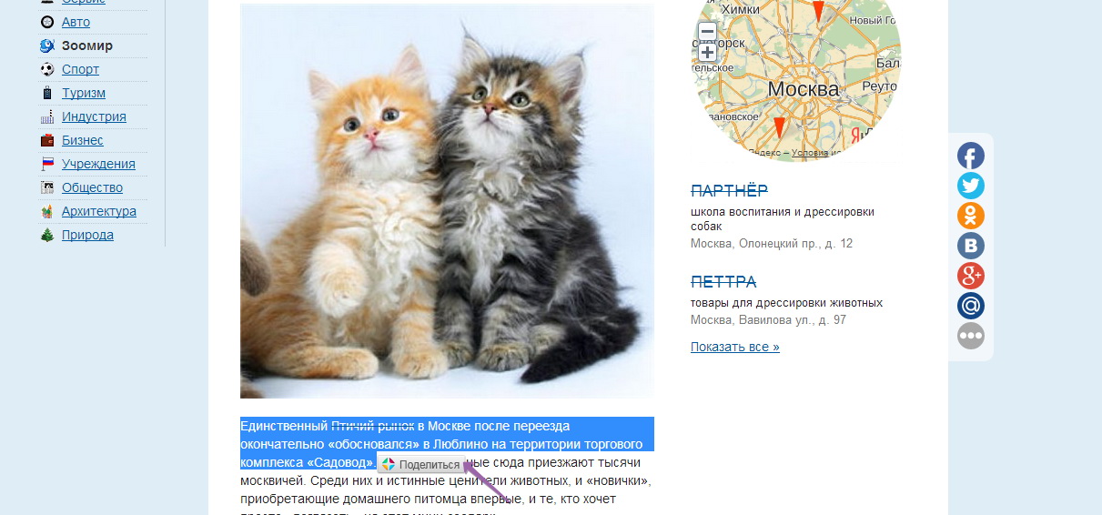 3. Кстати ещё одна очень удобная опция расшаривания «для ленивых» пользователей есть у UpToLike – это цитирование по тексту: пользователь выделяет понравившеюся цитату в тексте, и именно эту цитату ему предлагается автоматически вставить в его пост на его странице в соцсети.