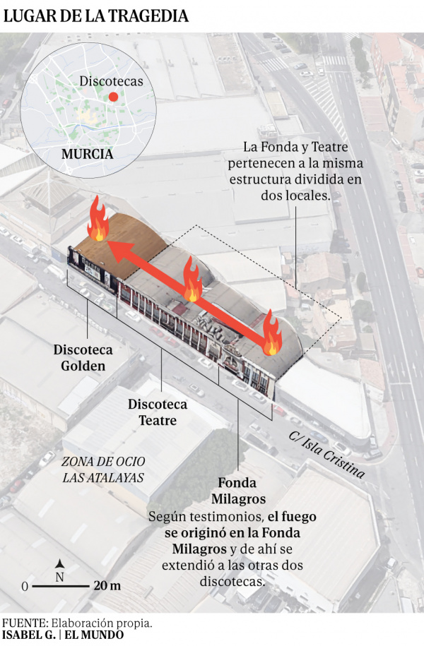 Первый сигнал тревоги поступил в службу 112 в шесть часов утра. Звонок поступил из дискотеки Teatre, которая также пострадала от пожара, хотя все указывает на то, что она была полностью эвакуирована. Спустя несколько минут поступил еще один звонок с той же площадки, в котором сообщалось, что горит потолок над диджейской будкой. В 6.05 на телефон службы спасения поступил первый звонок из Fonda, также сообщавший о пламени. В 6.06 женщина, рыдая, отправила голосовое сообщение своей матери из того же заведения: "Мамочка, я тебя люблю. Мы умрем. Я люблю тебя". С тех пор родители не получали от нее никаких известий.